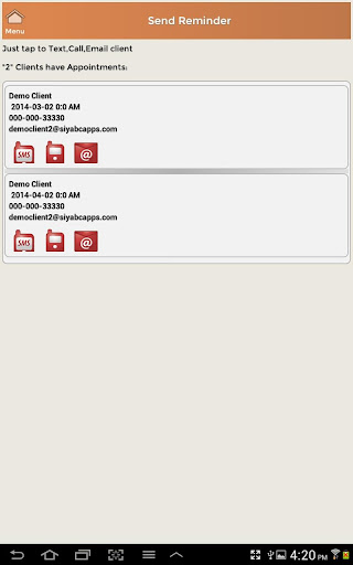 - Schedule events or appointments and view them by day, week, month or year. Remind clients via SMS, email or phone call with just ONE tap. App even pre-fills the message for you that you can customize as you please. Supports Google calendar sync.